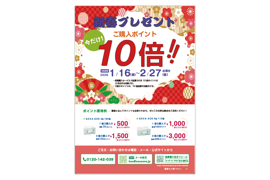 そんな時だからこそ、皆様にご自身のカラダと向き合い、カラダからの“声”を感じながら、より元気に過ごしていただきたいと考えております。そのためには、やはり「健康」あってこそ!そうした想いを形にするべく、株式会社エーオーエーアオバでは、今年も『新春アオバのポイント10倍プレゼント』を実施致します。